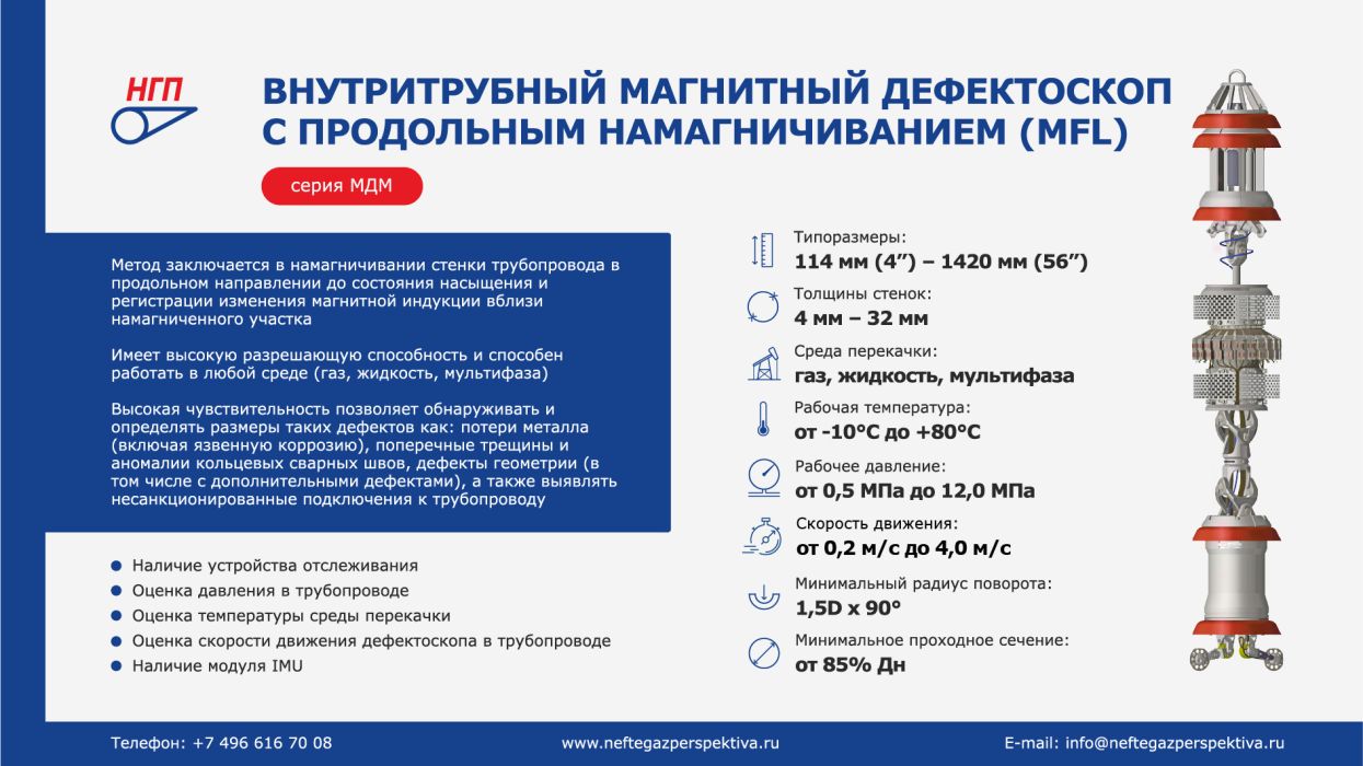 Магнитные дефектоскопы высокого разрешения разработки ООО «НГП» способны обнаруживать и определять размеры таких аномалий как: потери металла, поперечные трещины и аномалии кольцевых сварных швов, имеют одни из лучших характеристик по определению углового положения особенностей и пройденной дистанции, повышенную вероятность разграничения между внутренними и внешними дефектами, а также низкий уровень шума, что позволяет более точно фиксировать фоновую коррозию.