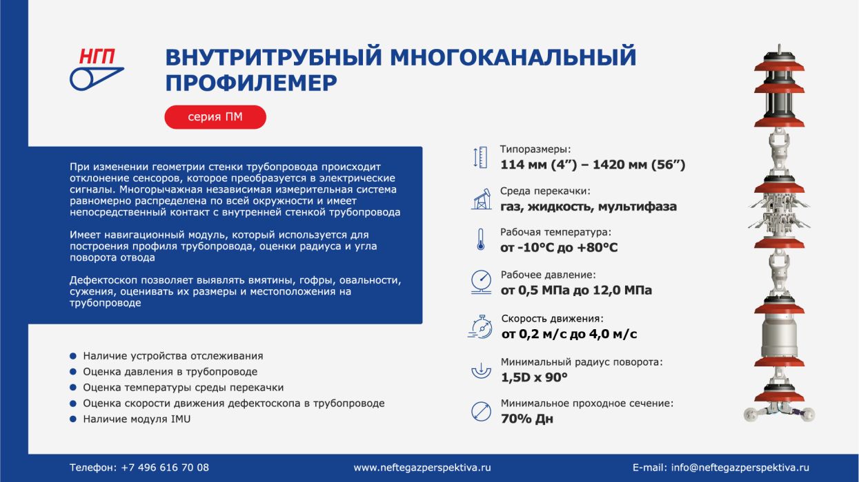 ООО «НГП» оказывает услуги по обнаружению, локализации и оценке размеров вмятин, овальностей, гофр и сужений, образующихся в результате внешних механических повреждений, а также вызванных движением грунтов в месте залегания объекта диагностики.